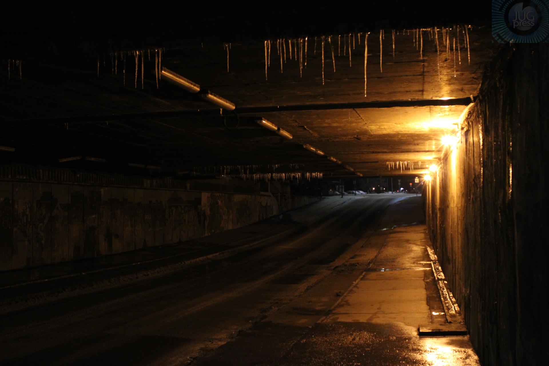 Leskovački podvožnjak je već nekoliko dana umrznut. Ledenice vise i mogu svakog trenutka da padnu na glavu pešacima ili na krovove automobila. Izgleda