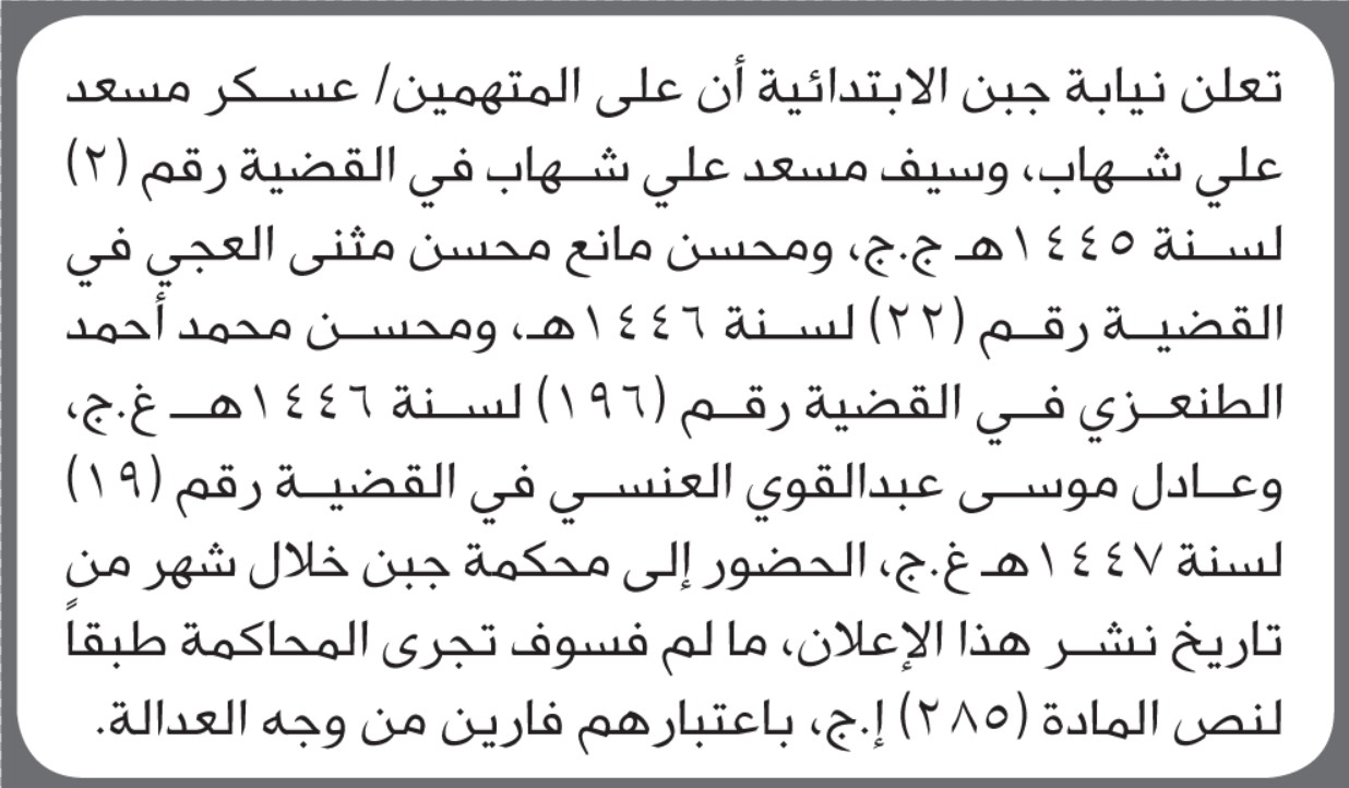 تعلن نيابة جبن الابتدائية بأن على/ عسكر مسعد شهاب وآخرين الحضور إلى المحكمة