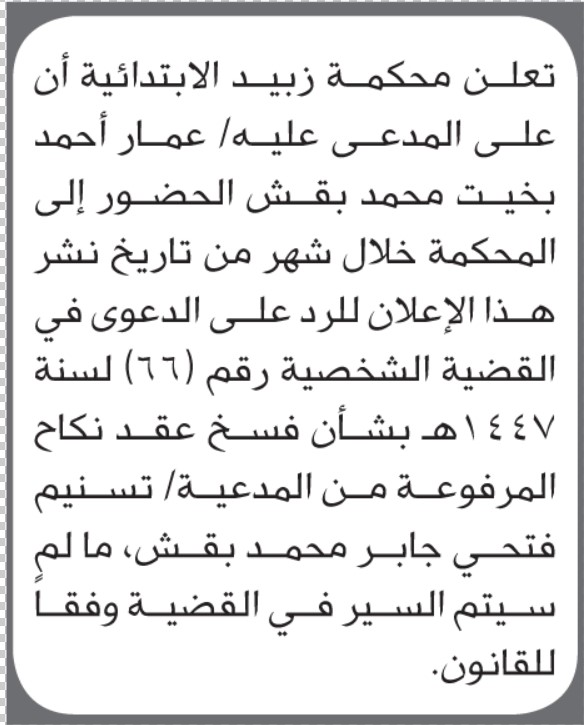 تعلن محكمة زبيد أن على المدعى عليه عمار بقش الحضور الى المحكمة