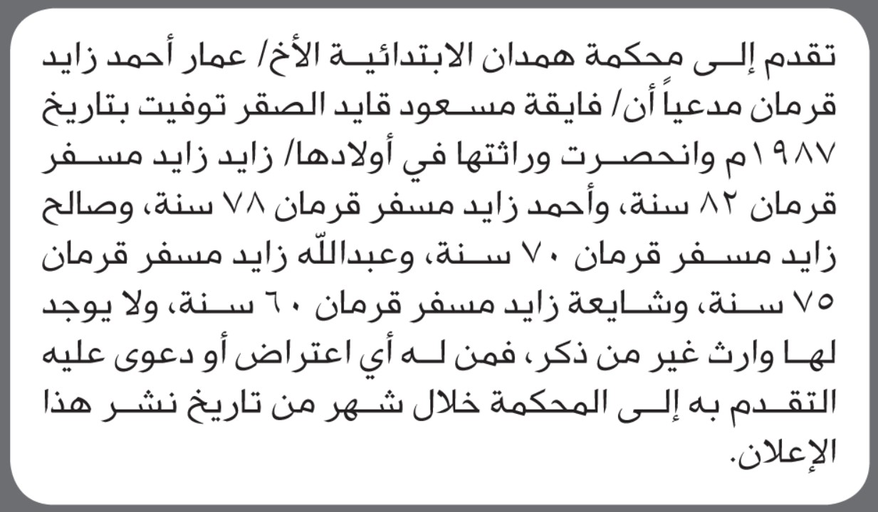 تعلن محكمة همدان الابتدائية بأن الأخ/ عمار أحمد قرمان تقدم إليها بطلب انحصار وراثة