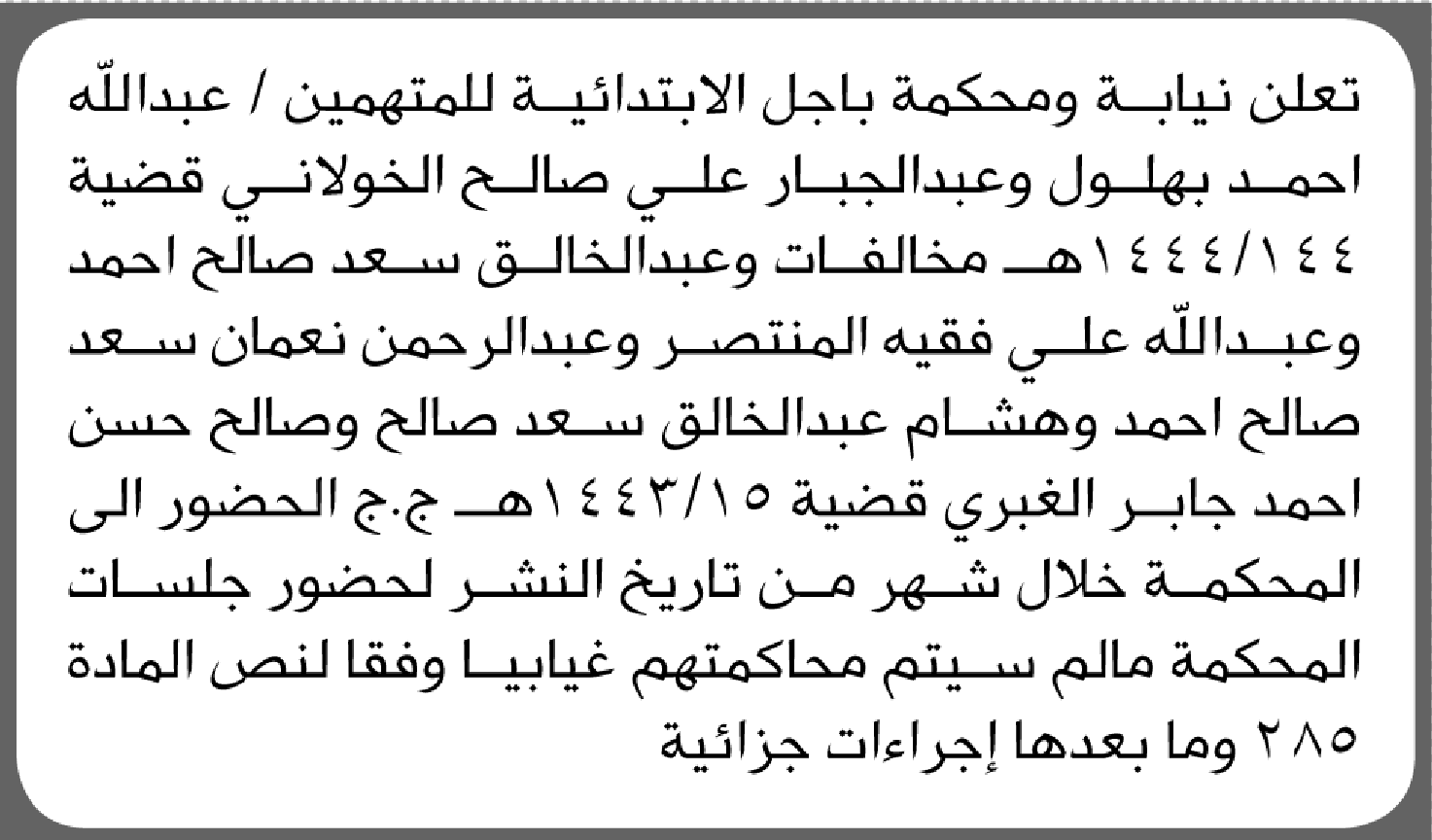 تعلن محكمة باجل أن على المتهمين الحضور الى المحكمة