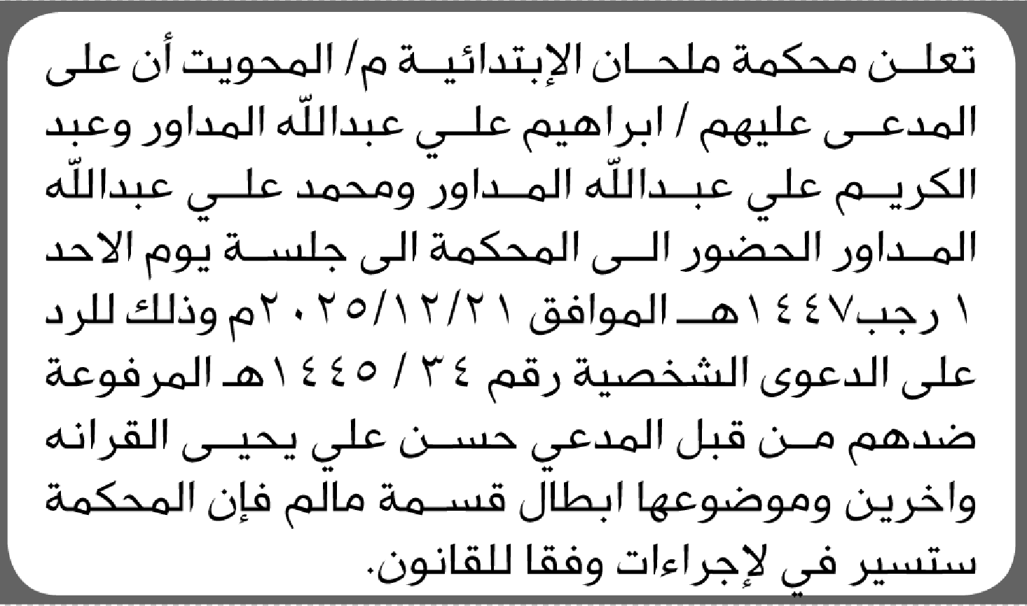تعلن محكمة ملحان م/المحويت أن على المدعى عليهم الحضور الى المحكمة