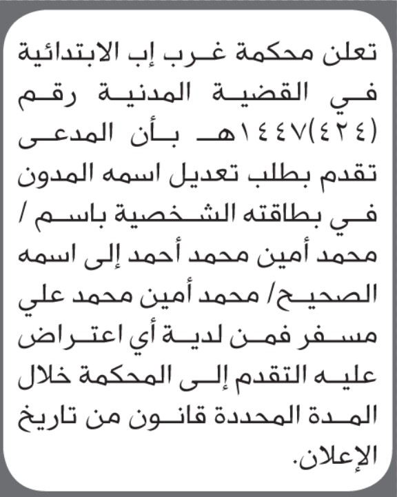 تعلن محكمة غرب إب الابتدائية بأن الأخ/ محمد أمين أحمد تقدم إليها بطلب تصحيح اسمه