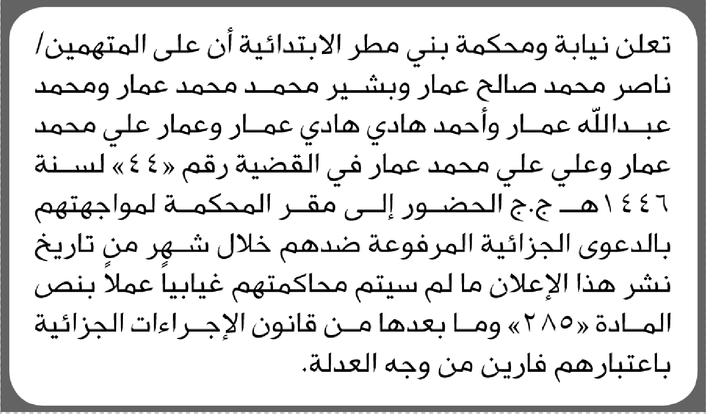 تعلن محكمة بني مطر الابتدائية بأن على/ ناصر محمد عمار وآخرين الحضور إلى المحكمة