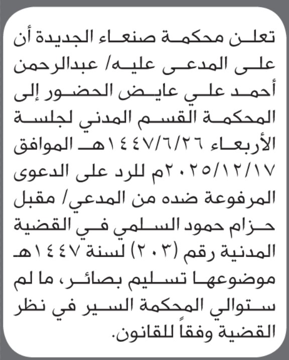 تعلن محكمة صنعاء الجديده أن على المدعى عليه عبدالرحمن عايض الحضور إلى المحكمة