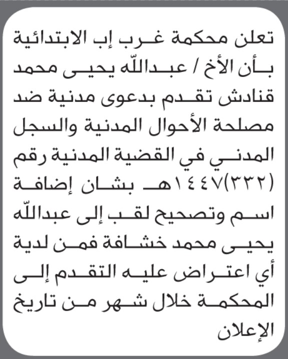 تعلن محكمة غرب إب الابتدائية بأن الأخ/ عبدالله يحيى قنادش تقدم إليها بطلب تصحيح اللقب