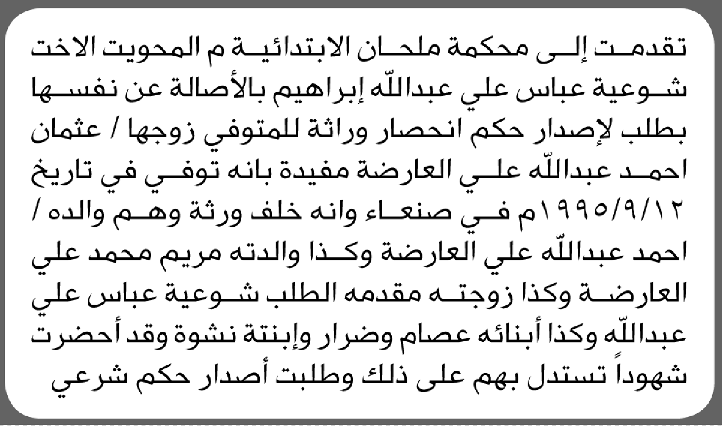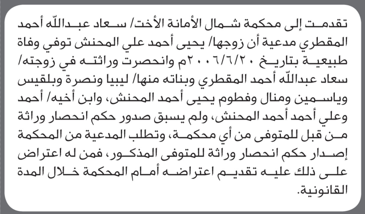 تعلن محكمة شمال الأمانة بأن الأخت/ سعاد عبدالله المقطري تقدمت إليها بطلب انحصار وراثة