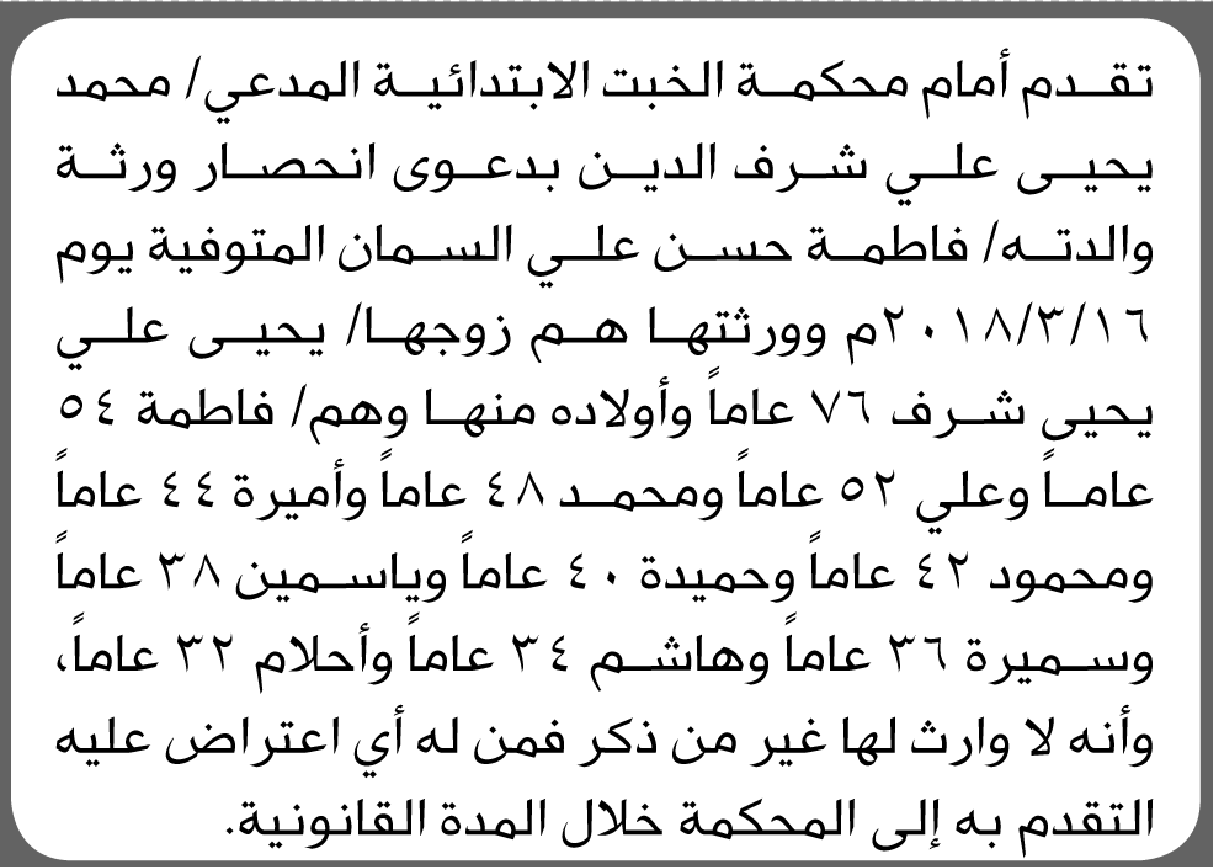 تعلن محكمة خولان أنه تقدم إليها محسن المختنق بطلب إنحصار وراثة