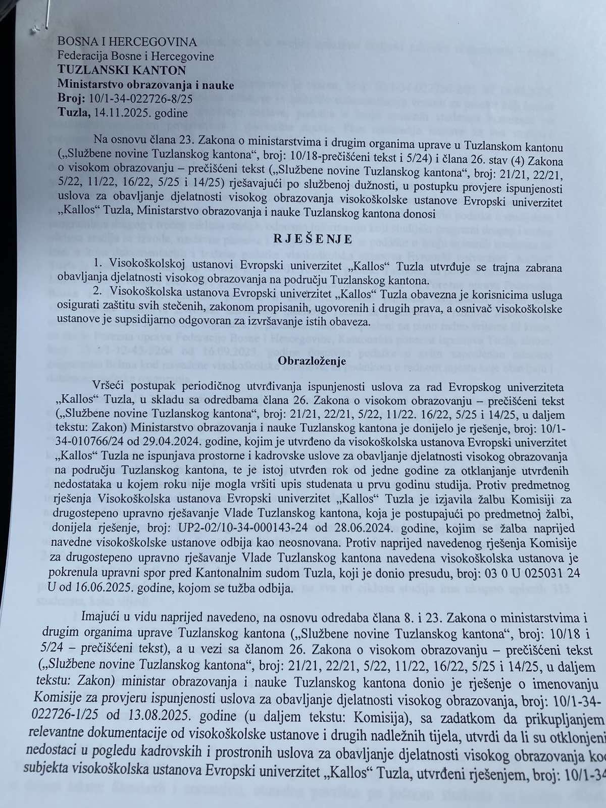 Evropskom univerzitetu „Kallos”, trajno je zabranjen rad na području Tuzlanskog kantona! Rješenjem Ministarstva obrazovanja i nauke Tuzlanskog kantona,