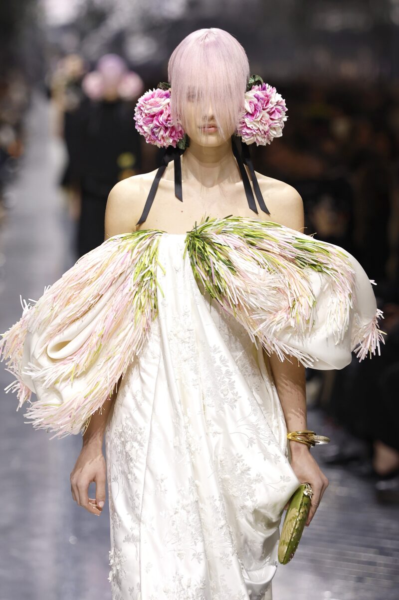 Na debiju haute couture kolekcije Christiana Diora za proleće 2026. godine, Jonathan Anderson je modnu pistu pretvorio u cvetnu oazu. Ceo plafon šatora za reviju bio je prekriven malim pupoljcima u nežno ružičastoj i beloj nijansi – dok su iste cvetne note krunisale modele kroz aksesoar koji je osmislio Stephen Jones, podsećajući na slušalice ili ušnu oblogu, i inspirisale tonove svežeg, svetlucavog mejkapa.